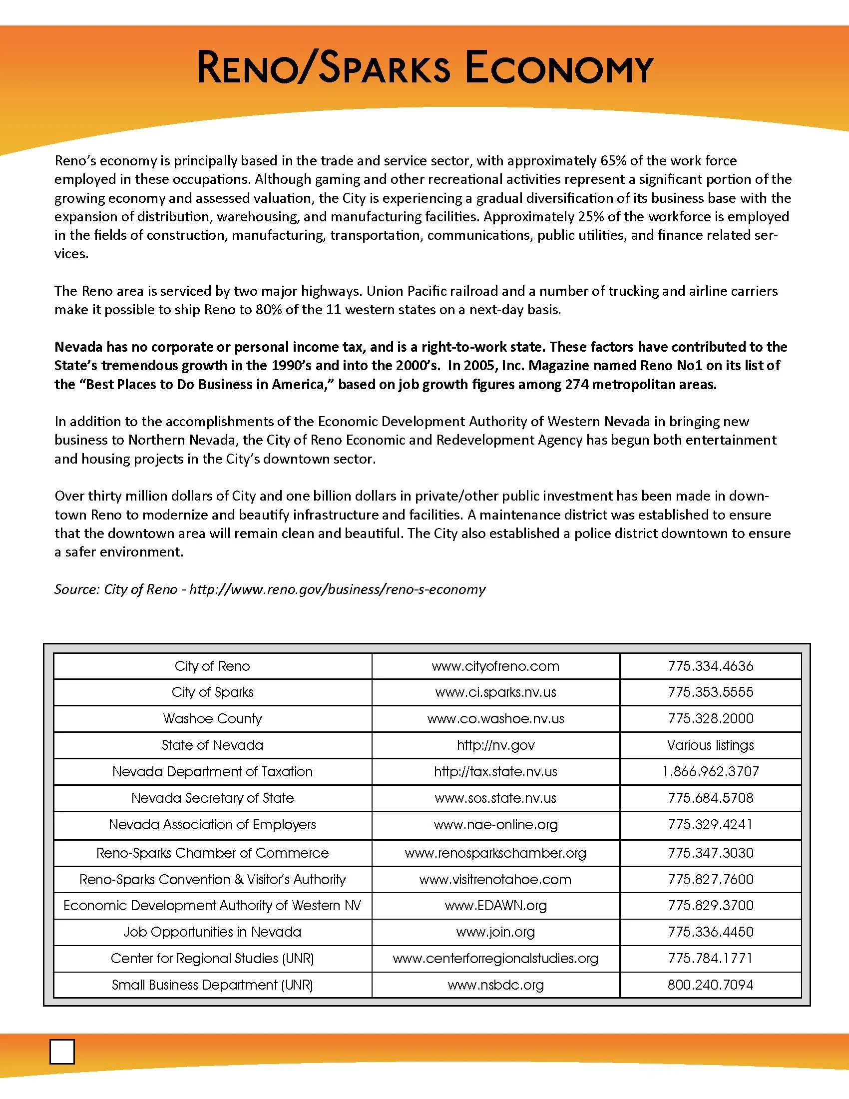 The Reno-Sparks area is an outstanding place to start, grow, or expand a business. The absence of any corporate, personal income, unitary, inventory, or franchise tax; a central location close to all California and other western markets; a transportation hub on Interstate 80 and U.S. Route 395; abundant space for industrial and commercial development; an advanced telecommunications infrastructure; business-friendly regulations; an excellent land-grant university; and an emerging technology sector create an ideal business environment for any business.